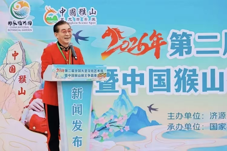 4月16日,2026年第二届大圣文化艺术周暨中国猴山猴王争霸赛新闻发布会在国家植物园(北园)举行。著名表演艺术家、“济源公益文旅形象大使”六小龄童现身会场。他身后,1986版《西游记》剧组的取景地;他面前,是一段即将在河南济源续写的西游新篇。