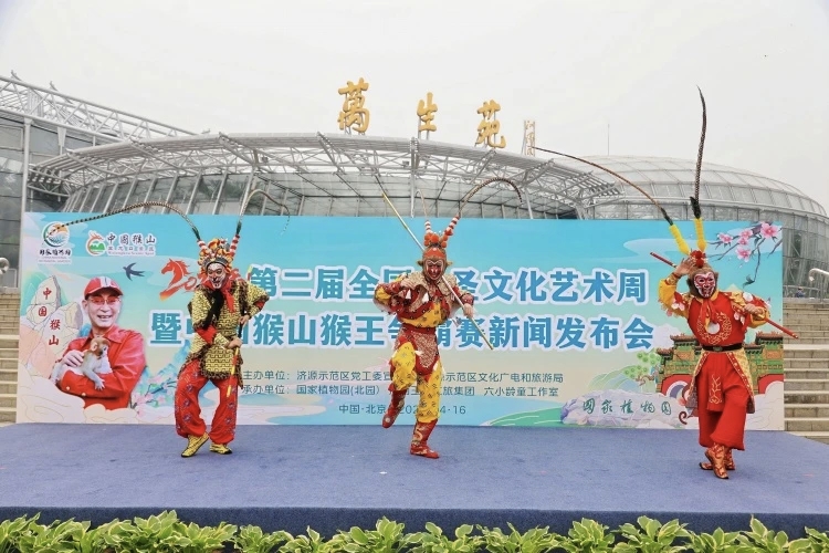 发布会上,国家植物园与济源五龙口景区达成合作意向,双方将以西游文化为纽带,共同探索生物多样性保护、文化传播、文旅发展的融合之路。同时,六小龄童与五龙口景区的联名门票在发布会上首次亮相,主办方将这份具有纪念意义的门票赠予国家植物园。据悉,该联名门票将在本届大圣文化艺术周暨中国猴山猴王争霸赛期间正式发售。2025年首届活动曾创下“最多人装扮成孙悟空聚会”吉尼斯世界纪录,全网曝光量破亿。近年来,济源正以西游文化为抓手,不断擦亮“中国猴山・文美济源”城市名片。