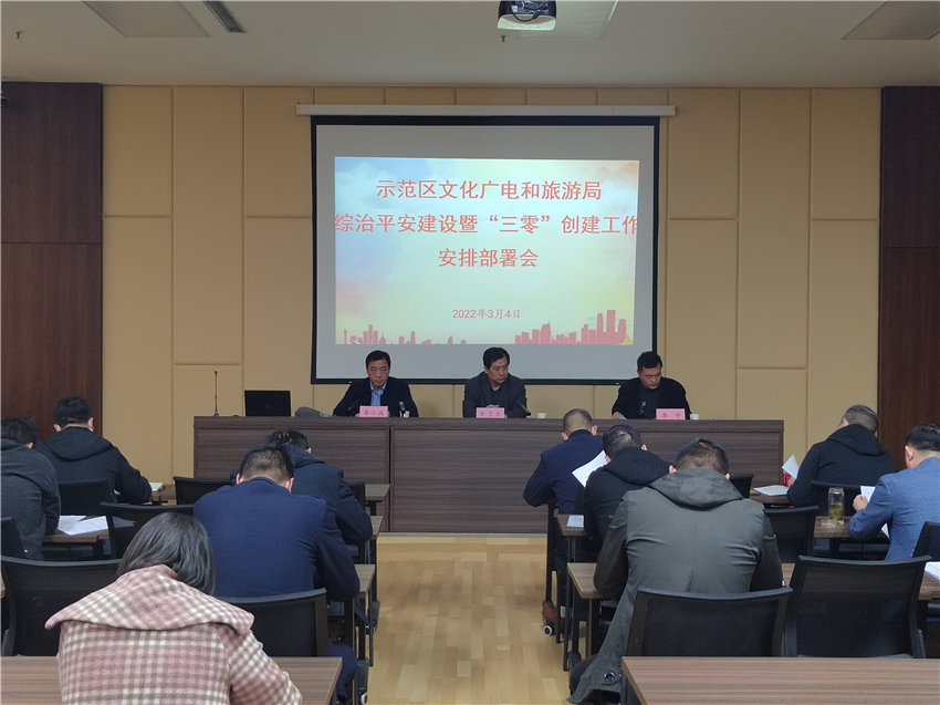 文广旅局党组成员李中宣读了《深入开展文旅行业“三零”创建工作实施方案》,要求各单位、各科室深入开展创建工作,建设“周研判”机制、评定验收机制、“四色预警”机制和考核奖惩机制,促使矛盾纠纷妥善化解、安全隐患整治有效和社会治安平稳有序,完成三零创建工作任务,保障文旅行业的平安和谐。