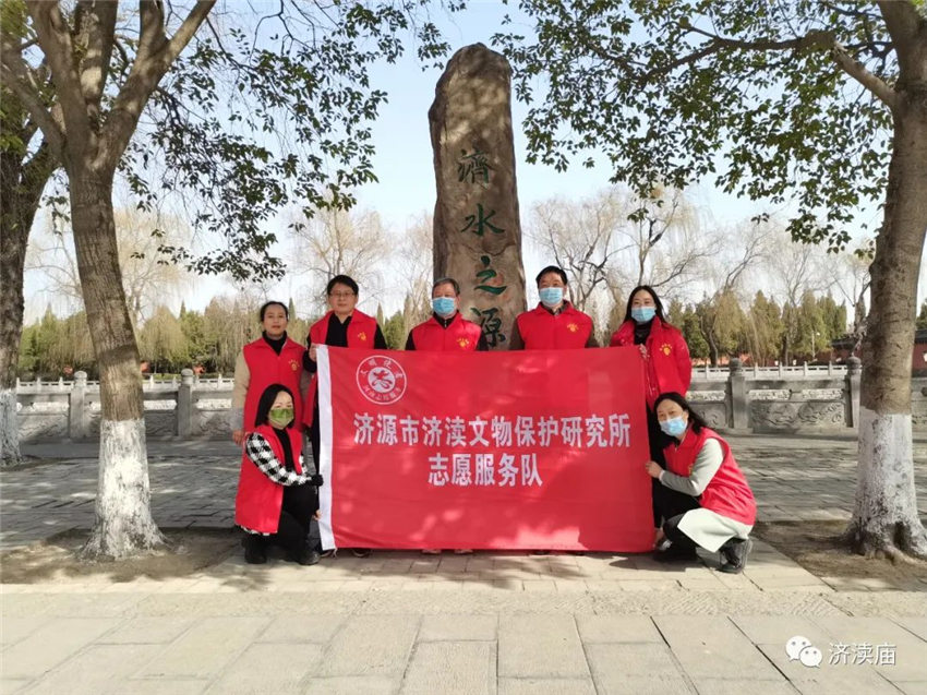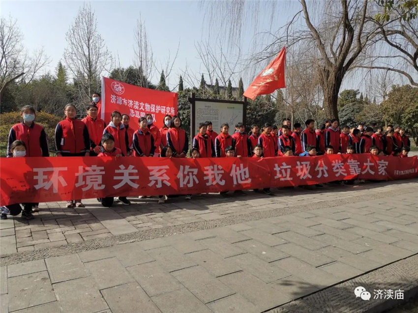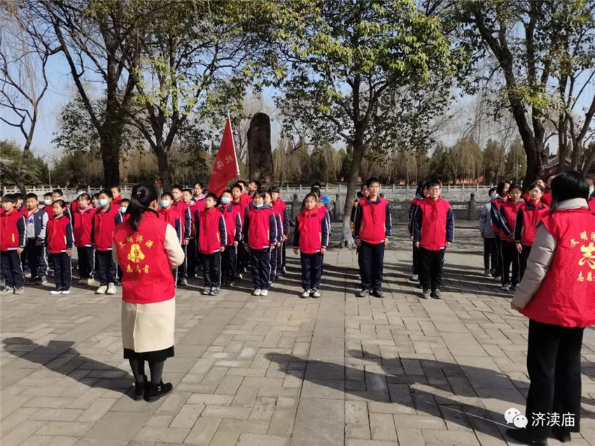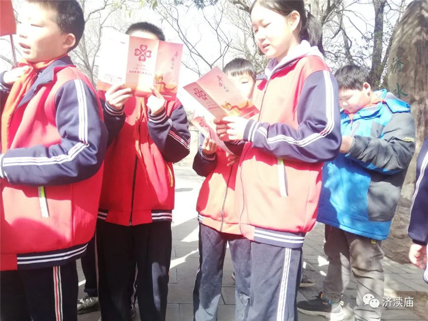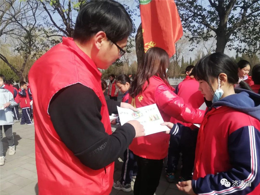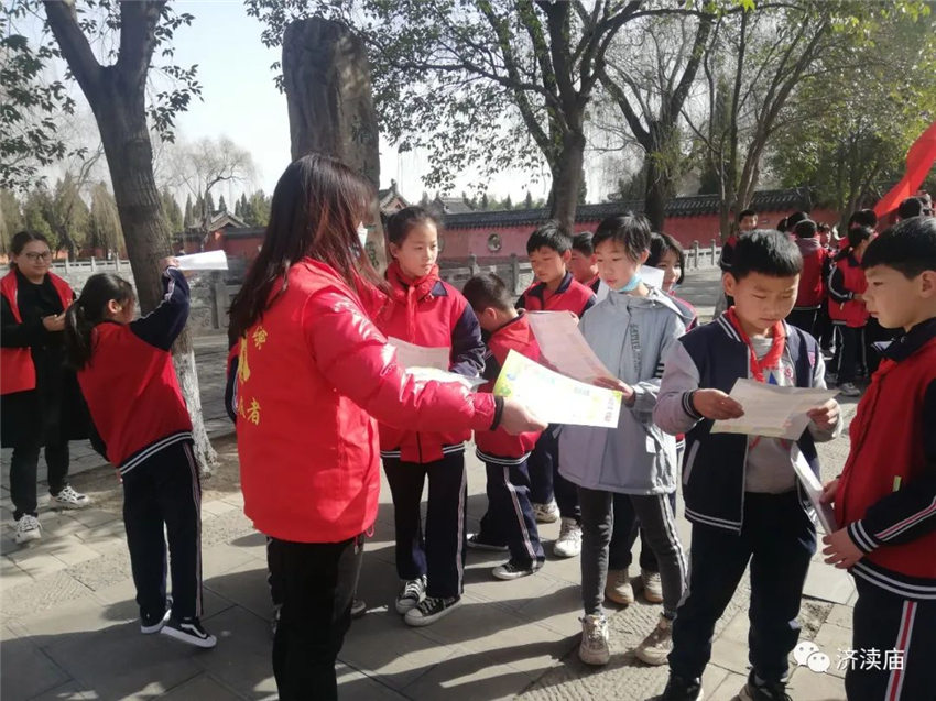 济渎庙志愿服务者现场发放生活垃圾分类、文明旅游、“三零”创建、文物保护宣传页200余份,动员孩子们将带回家,发挥“小手拉大手”的积极作用,依托青少年学生带动家庭,形成以教育一个孩子带动一个家庭,文明整个社会的良好局面。此外,志愿者免费向游客提供热水、讲解科普文物知识等活动。