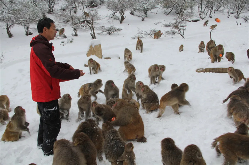 近30年来,甘苦相伴,他与猕猴建立了深厚感情。别人驯猴是“打猴”,匡三傲驯猴却有“独门秘笈”,他能和山上的猴子“和谐交流”、“不打不骂”。匡三傲对猴群的习性特点了如指掌,全景区共有3000余只猕猴,分为16群。这些猴群的活动区域、活动路线、猴子的语言交流、年龄比例、雌雄比例、采食区域及采食的种类,匡三傲都铭记于心。喂食、投食、普查,最远的一天要跑一百二三十里,白天出去,晚上归来,对匡三傲来说是太正常的事情了。隆冬季节的太行山气候寒冷,滴水成冰,猕猴们很难找到充足的食物,匡三傲就步行上山给它们投食。