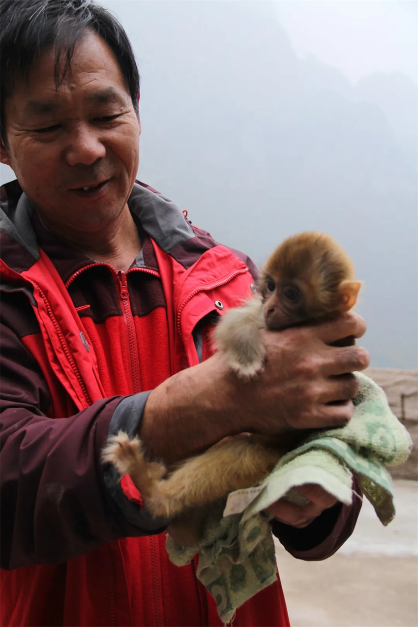 每当游客到来,伴随着匡师傅的声音,先是零散跳跃着的成年公猴,后面便跟着大小混杂的整个猴群排成一条直线的猴群奔跑着下山,游客发出阵阵惊呼与掌声,这才是对匡师傅最大的认可吧。