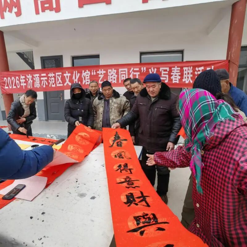 春节将至,为弘扬中华民族优秀传统文化,丰富和活跃群众精神文化生活,增添喜庆祥和的节日氛围,2026年2月3日和5日,济源示范区文化馆组织书法志愿者,分别走进王屋镇愚公村、邵原镇黄北角村,开展“艺路同行˙联进万家”志愿服务义写春联活动。